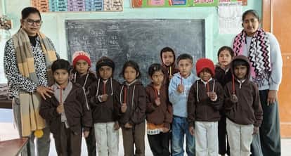 20 बच्चों को पेंसिल देतीं एआर फाउंडेशन की अध्यक्ष रितु सैनी और सदस्य निधि। स्रोत : फाउंडेशन