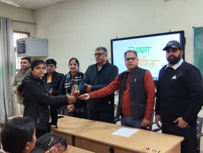 प्रतियोगिता में पोजीशन पाने वाले छात्रों को सम्मानित करते सदस्य