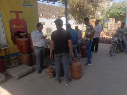 उपभोक्ताओं को सिलेंडर देते हुए एजेंसी कर्मचारी। संवाद
