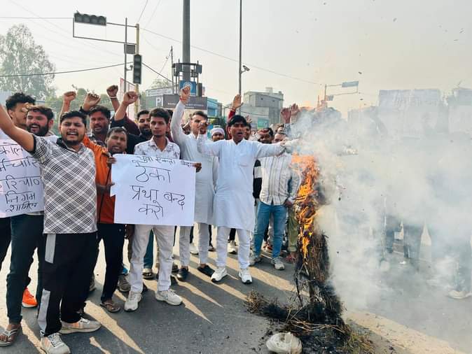 Sonipat News: ठेके प्रथा के पुतले की शवयात्रा निकाल कर जलाया