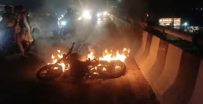 फोटो :31: सोनीपत के मुरथल फ्लाईओवर जलती बाइक के पास से गुजरते दोपहिया सवार। स्रोत पाठक