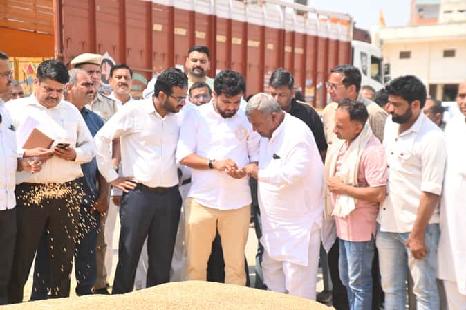 फोटो : सोनीपत के गन्नौर अनाज मंडी में गेहूं की फसल की जांच करते विधायक देवेंद्र कादियान। स्रोत: