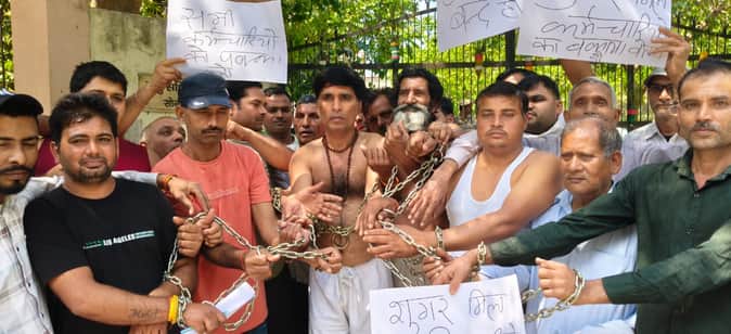 फोटो : सोनीपत लघु सचिवालय के गेट पर अर्धनग्न होकर हाथों में बेड़ियां बांधकर विरोध जताते संविदा