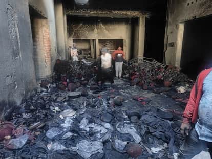 गोहाना में आग लगने के बाद जला पड़ा श्री श्याम टेक्सटाइल का माल और कंडम हो चुकी बिल्डिंग। संवाद