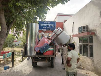 गन्नौर के रेलवे रोड पर अतिक्रमण के सामान को जब्त कर ले जाते नपाकर्मी। संवाद