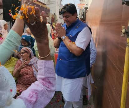 सभा में पहुंचे कांग्रेस जिला अध्यक्ष कमल दिवान का फूलों की वर्षा कर स्वागत करते लोग। स्राेत : प