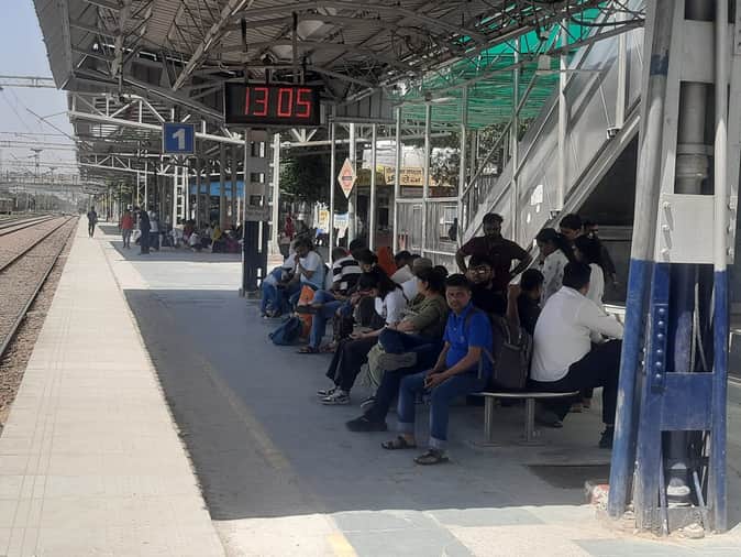 फोटो: सोनीपत रेलवे जंक्शन पर ट्रेन आने के इंतजार में बैठे यात्री। संवाद