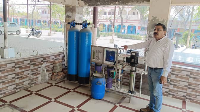 फोटो : 3, सोनीपत के गांव दातौली स्थित पीएम श्री राजकीय वरिष्ठ माध्यमिक विद्यालय में स्थापित आरओ प्लांट दिखाते प्रधानाचार्य विवेक शर्मा। स्रोत: विद्यालय