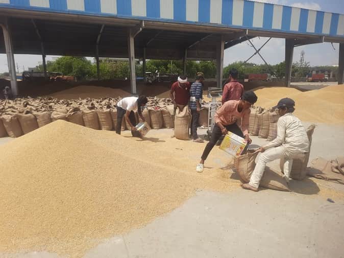 फोटो : सोनीपत अनाज मंडी में जूट के बैग में गेहूं डालते मजदूर। संवाद