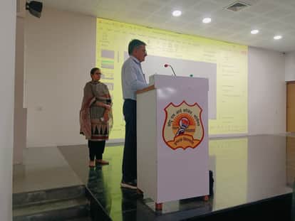 छोटू राम आर्य कॉलेज में आयोजित एक्सटेंशन लेक्चर में अपनी बात रखते वक्ता। स्रोत : संस्था