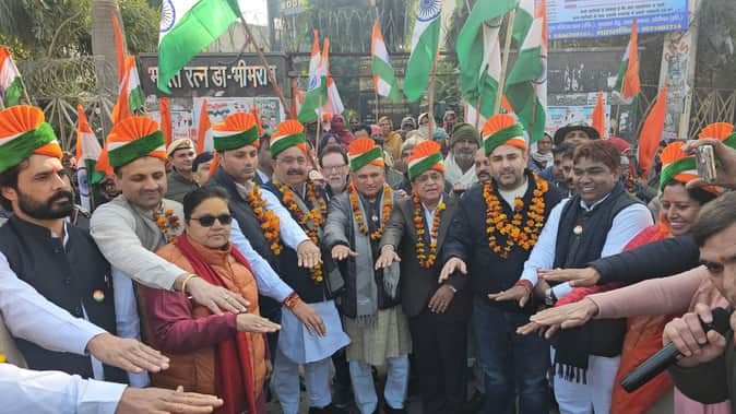 फोटो : सोनीपत में तिरंगा यात्रा के दौरान राष्ट्रीय मतदाता दिवस पर शपथ लेते विधायक निखिल मदान,
