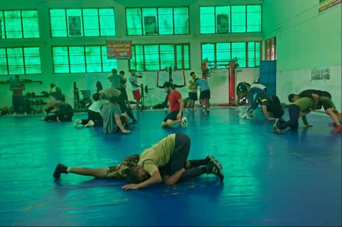 फोटो : सोनीपत के गांव जुआं स्थित कुश्ती अकादमी में अभ्यास करते पहलवान। स्रोत: पुलिस प्रवक्ता