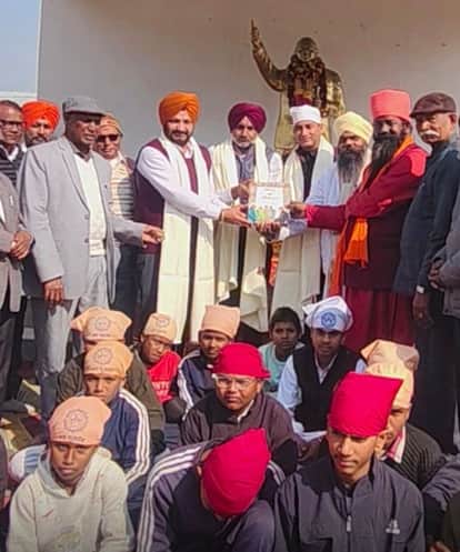 गुरु रविदास मंदिर में परमजीत सिंह चंगनौली को सम्मानित करते महंत निर्मल दास। स्वयं