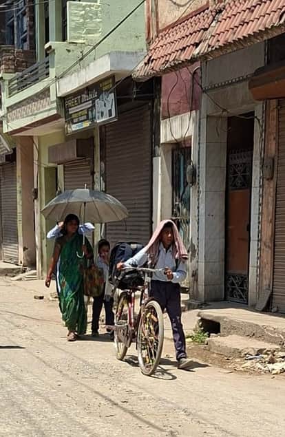 छाता लेकर जाती महिला और सिर पर कपड़ा रखकर जाता बच्चा। संवाद