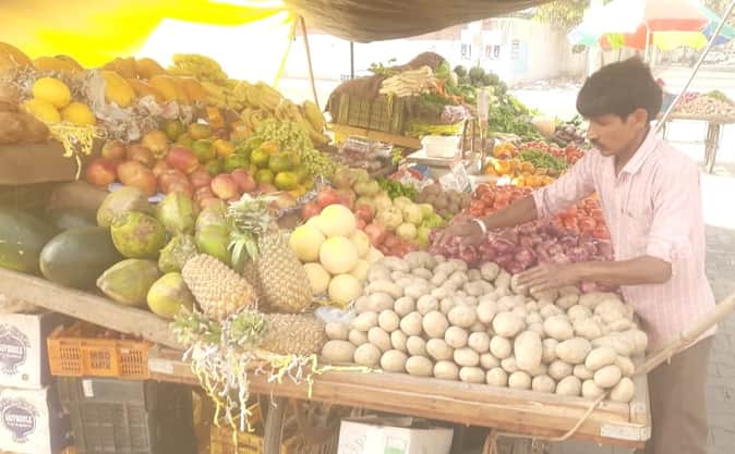 मॉडल टाउन में बेचने के लिए दुकान पर आलू रखता संचालक। संवाद