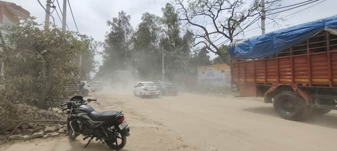 निर्माणधीन स्टेट हाइवे पर वाहनों के गुजरने से उड़ती धूल। संवाद