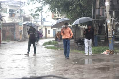 बारिश से बचने के लिए छाता लेकर गुजरते युवक। संवाद