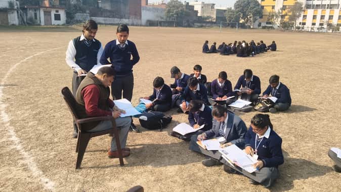धूप निकलने पर एमएलएन स्कूल के प्रांगण में पढ़ाई करते विद्यार्थी। संवाद