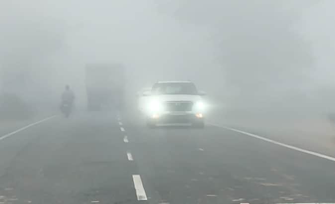 जगाधरी-अंबाला रोड पर कोहरे में लाइट जलाकर गुजरते वाहन। संवाद