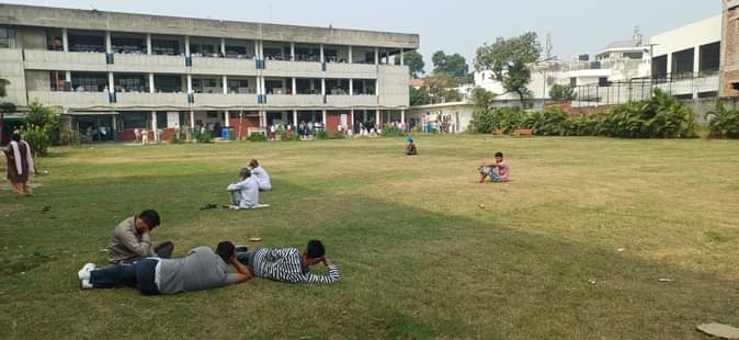 जिला न्यायालय परिसर के मैदान में धूप का आनंद लेते लोग। संवाद