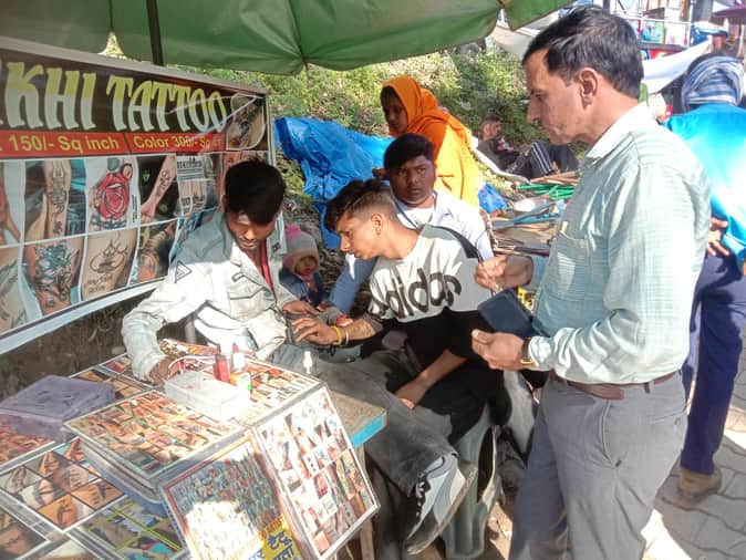 घुमारवीं ग्रीष्मोत्सव में टैटू बनाने वाले स्टॉल का निरीक्षण करते स्वास्थ्य विभाग के अधिकारी। सं
