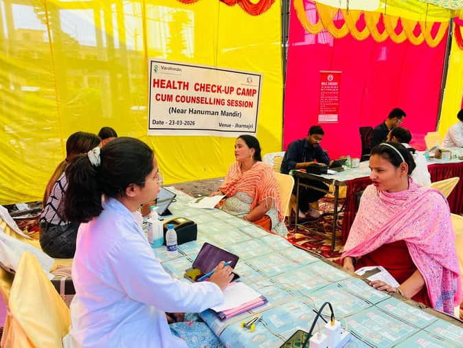 झाड़माजरी के हनुमान मंदिर में लगाए निशुल्क स्वास्थ्य जाँच शिविर में रोगियों की जांच करते हुए-