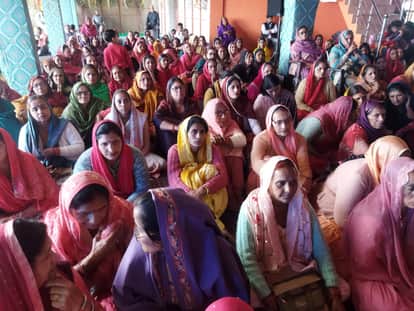 कोटलु ब्राह्मणा स्थित शिव मंदिर में चल रही श्रीमद् देवी भागवत कथा में मौजूद श्रद्धालु। स्रोत: आ