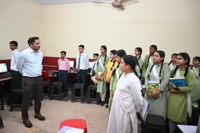बिलासपुर कन्या पाठशाला में निरीक्षण पर पहुंचे उपायुक्त बच्चों से संवाद करते। स्रोत: डीपीआरओ