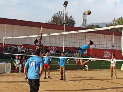 बरमाणा में आयोजित कहलूर वॉलीबाल प्रतियोगिता में दमखम दिखाते खिलाड़ी। स्रोत: आयोजक
