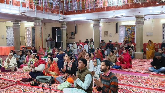 श्री लक्ष्मी नारायण मंदिर में चल रही कथा में मौजूद श्रद्धालु। स्रोत: आयोजक