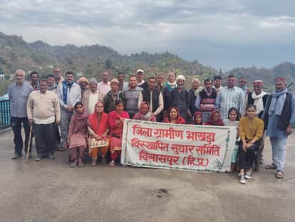 प्यूगली में आयोजित जिला ग्रामीण भाखड़ा विस्थापित सुधार समिति की बैठक में मौजूद सदस्य। स्रोत: सम