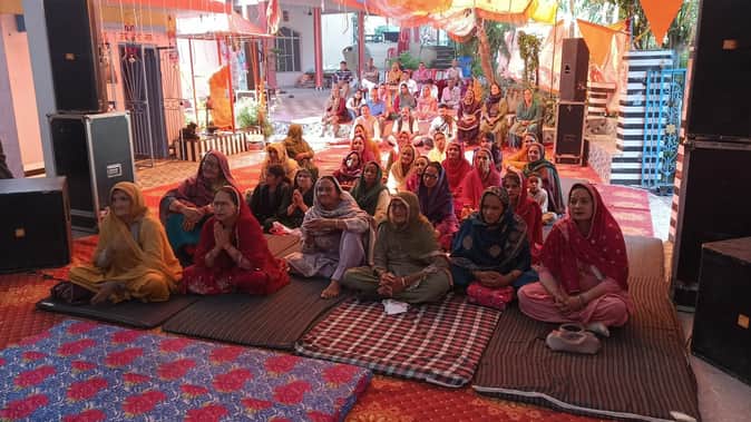 मां संतोषी माता मंदिर परिसर में चल रही श्रीमद्भागवत कथा का श्रवण करते हुए श्रद्धालु। स्रोत: जाग