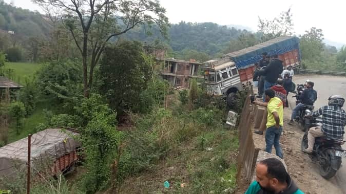 घुमारवीं-सरकाघाट हाईवे पर कुठेड़ा पुल के पास ट्रक व टेंपो की टक्कर। स्रोत: जागरूक पाठक