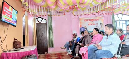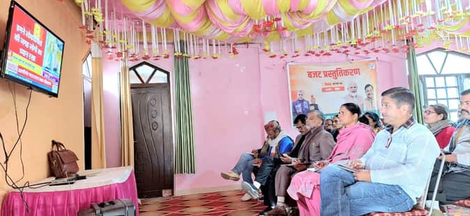 झंडूता में केंद्रीय बजट सुनते भाजपा विधायक व कार्यकर्ता। स्रोत: भाजपा