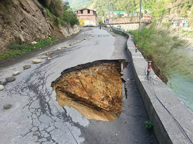 हेलीपैड के नीचे भरमौर-पठानकोट हाईवे बीचोंबीच भूस्खलन से बना छेद।