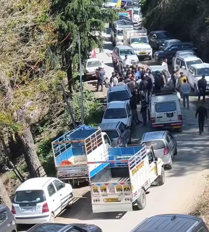 आपस में उलझे दोनों वाहनों के चालक, चंबा-सलूणी मार्ग पर दोनों ओर लगीं वाहनों की कतारें