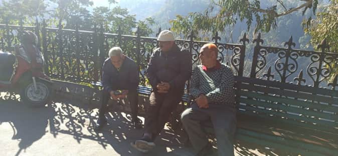 चंबा कैफे मार्ग पर बैंच पर बैठ धूप सेकते वरिष्ठ नागरिक।संवाद