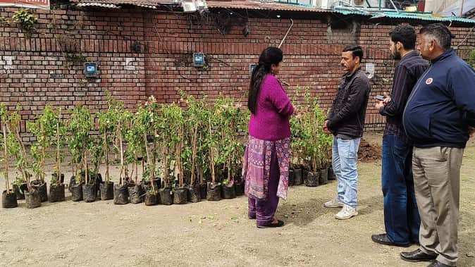 चंबा चौगान नंबर दो में रखे गये पौधे और कर्मचारियों से बात करते नगर परिषद अधिकारी