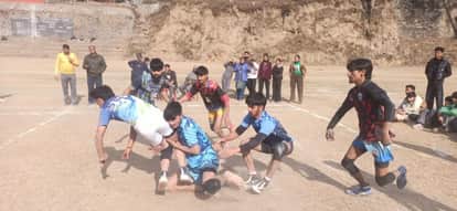 चंबा के पुलिस मैदान बारगाह में खेलकूद प्रतियोगिता में कबड्डी मैचके दौरान रेडर को पकड़ते विरोधी