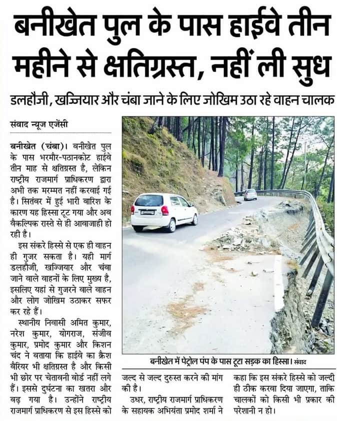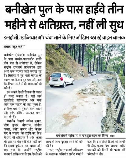 भरमौर-पठानकोट हाईवे पर बनीखेत पेट्रोल पंप से कुछ दूरी पर बरसात के दौरान भारी बारिश की जद में आने से हाईवे का एक पूरा हिस्सा जमींदोज हो चुका है। हाईवे का एक हिस्सा क्षतिग्रस्त होने से वाहन चालकों को गुजरते समय कठिनाइयों का सामना करना पड़ रहा है। लोगों के मुताबिक एक हिस्सा क्षतिग्रस्त होने से दूसरे एक हिस्से से ही वाहनों की आवाजाही हो रही है। इस संकरे हिस्से से एक ही वाहन गुजर सकता है। यही मार्ग डलहौजी, खज्जियार और चंबा जाने वाले वाहनों के लिए मुख्य है। लिहाजा, यहां से होकर गुजरने वाले वाहन चालक रिस्क लेकर ही आवाजाही करने को मजबूर है। इस मामले को अमर उजाला ने प्रमुखता से उठाया था।