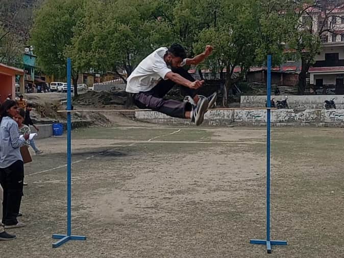 चंबा के लिल्ह कोठी कॉलेज में खेलकूद प्रतियोगिता के दौरान उंची कूद लगाता प्रतिभागी।संवाद