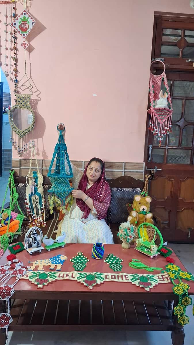 धयोटा गांव की अनुराधा ने मैक्रेम से बनाए गए सजावटी उत्पादों को दिखाते हुए। संवाद