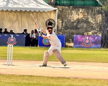 इंटरनेशनल क्रिकेट स्टेडियम दिल्ली में आयोजित मैत्री मैच में शॉट लगाते हुए सांसद अनुराग ठाकुर। स
