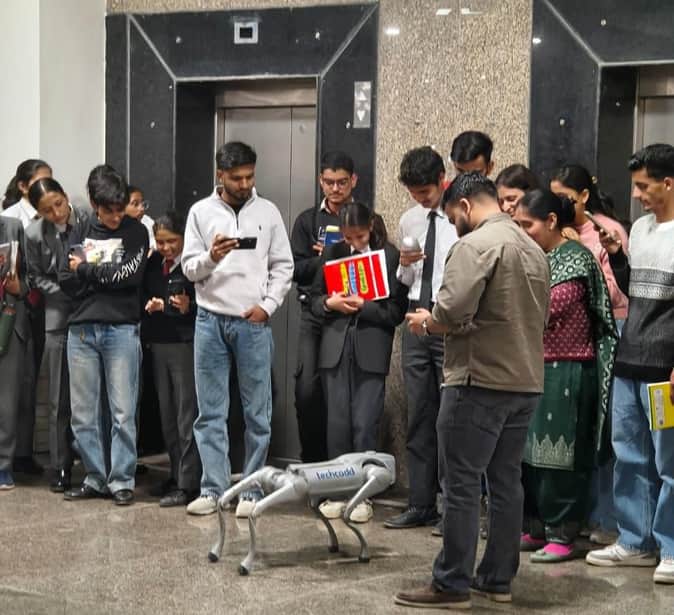 तकनीकी विश्वविद्यालय हमीरपुर में रोबोट को डेमो देखते विद्यार्थी। स्रोत : संस्थान