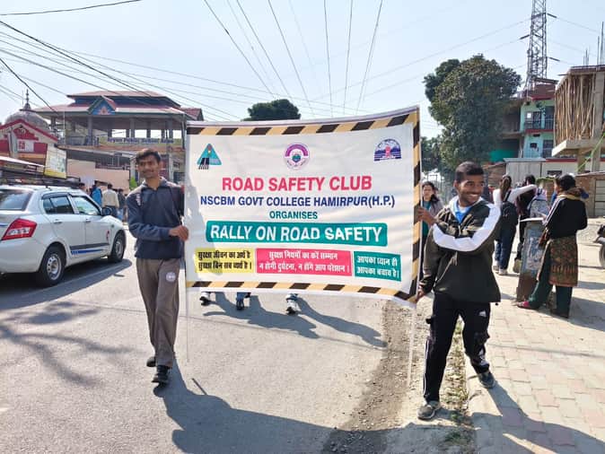 हमीरपुर महाविद्यालय के विद्यार्थी सड़क सुरक्षा नियमों पर जागरूकता रैली निकालते हुए। स्रोत संस्थ