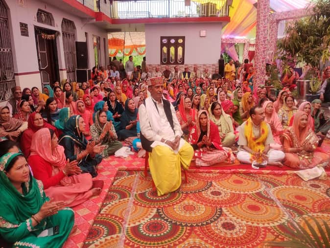 ग्राम पंचायत डिडवीं टिक्क्रर के गांव टिक्कर में आयोजित श्रीमद्भागवत कथा में उपस्थित श्रद्धालु क
