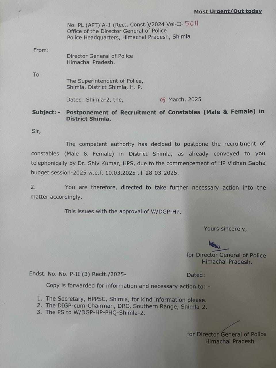 जिला शिमला में पुलिस विभाग में पुरुष और महिला कांस्टेबलों की भर्ती प्रक्रिया को स्थगित कर दिया गया है।