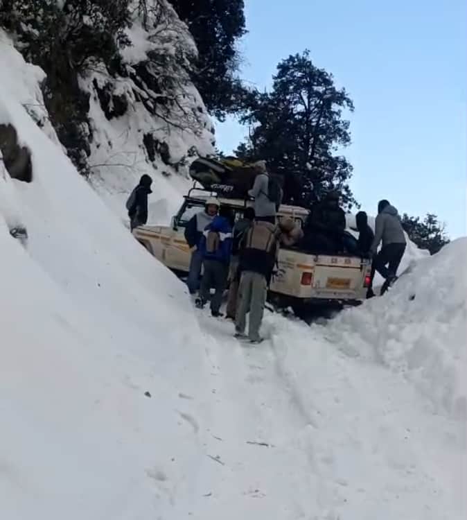 बिलिंग को जातेबर्फ में फंसी पैराग्लाइडर ले जा रही गाड़ी को निकालते पैराग्लाइडर पायलट। जागरू