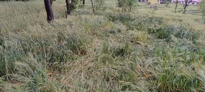 धर्मशाला के उपरेड़ में बारिश के कारण ढही गेंहू की फसल। लगातार बारिश के कारण फसल काली पड़ने लगी