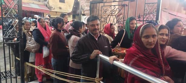 ज्वालामुखी मंदिर में रविवार को लाइनों में लगे श्रद्धालु । संवाद